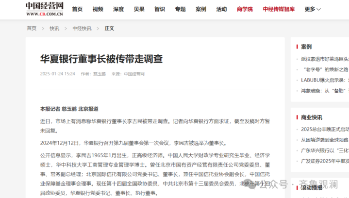 据媒体报道,2025年1月,市场消息称华夏银行董事长李吉民被带走调查。记者向华夏银行方面求证,截至发稿对方暂未回复。截至目前,8个月的时间过去了,关于李吉民仍未有官方公开消息。