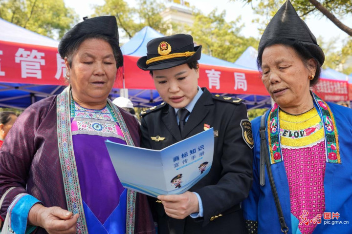 2026年3月13日,在广西柳州市融水苗族自治县芦笙文化广场,县市场监督管理局工作人员向市民宣传消费维权知识。(龙涛摄/光明图片)